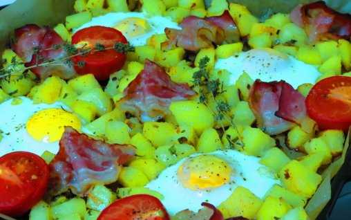 Realizare : Cartofii se curata, se spala si se taie cubulete. Se pun la fiert in apa cu sare, 15 minute. Se scurg apoi de apa si se amesteca cu ulei, sare, piper si ceapa verde taiata rondele, Se pregateste o tava cu hartie de copt si se rastoarna cartofii. Se pun in cuptorul incins, la foc mediu, inca 15 minute, pana incep sa se rumeneasca usor. Se scoate tava si se formeaza 4 goluri printre cartofi in care se sparge cate un ou. Se aseaza printre cartofi feliile de bacon si rosiile taiate pe jumatate. se presara cimbru uscat si se aseaza si cateva crengute de cimbru deasupra. Se mai pune tava in cuptor 10 minute, pana ce oul este facut. Se serveste calda. |